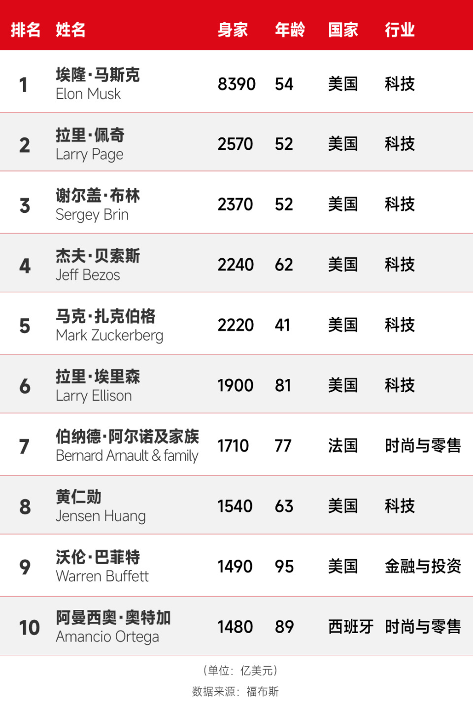 今年榜单中,最引人注目的只有一个人,他就是蝉联世界首富的马斯克。为什么呢?因为他的财富太夸张了,竟然达到了8390亿美元,约合5.8万亿元人民币。去年才3420亿美元,一年时间竟然增加了近5000亿美元。